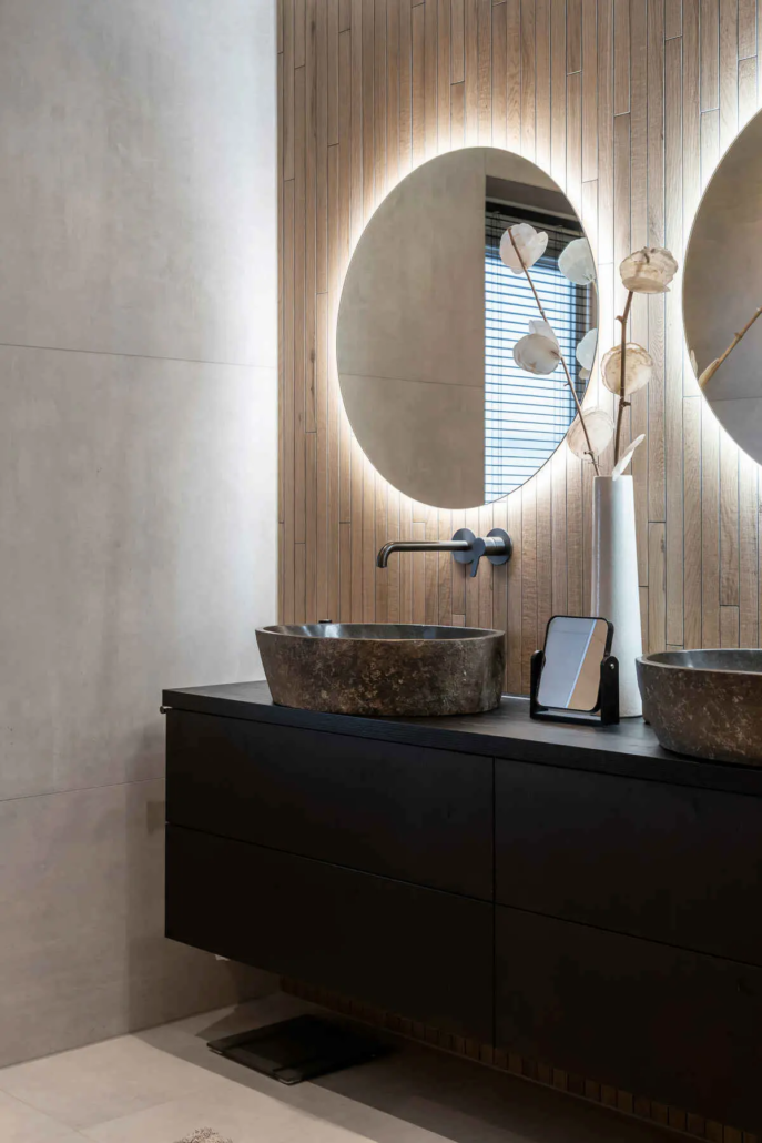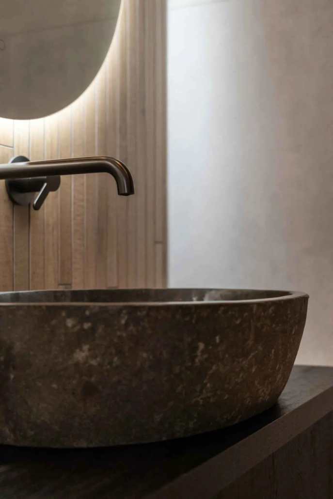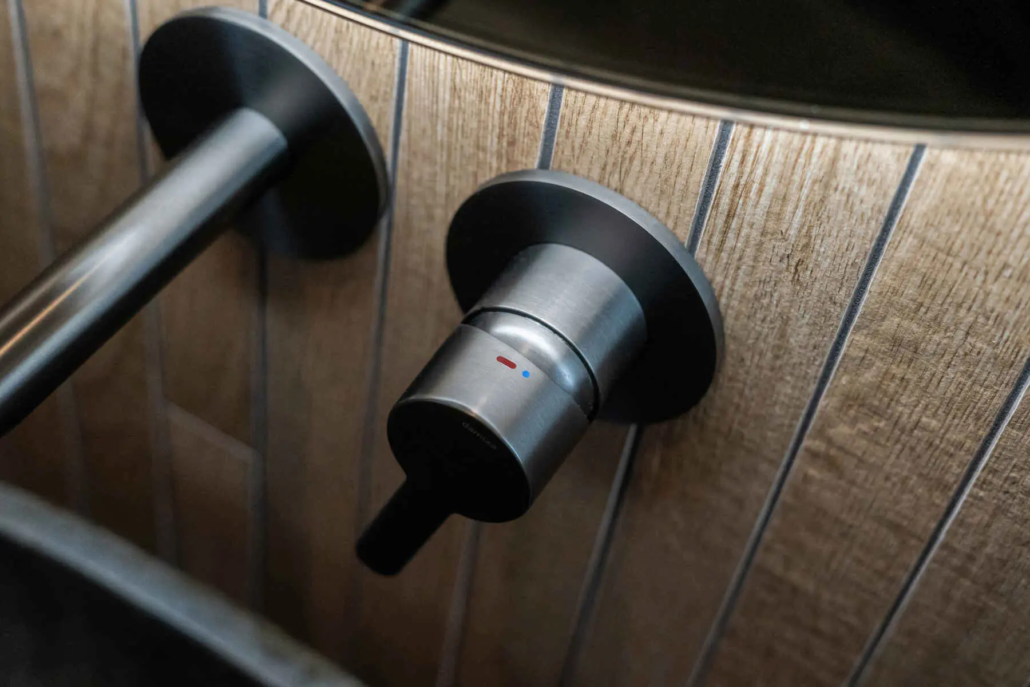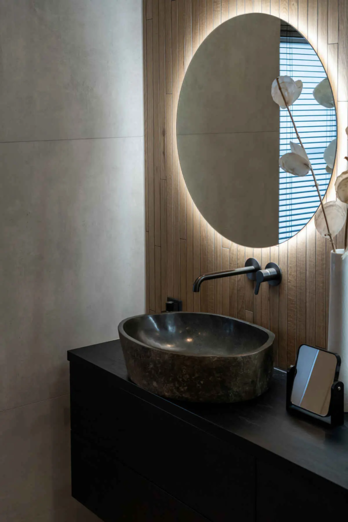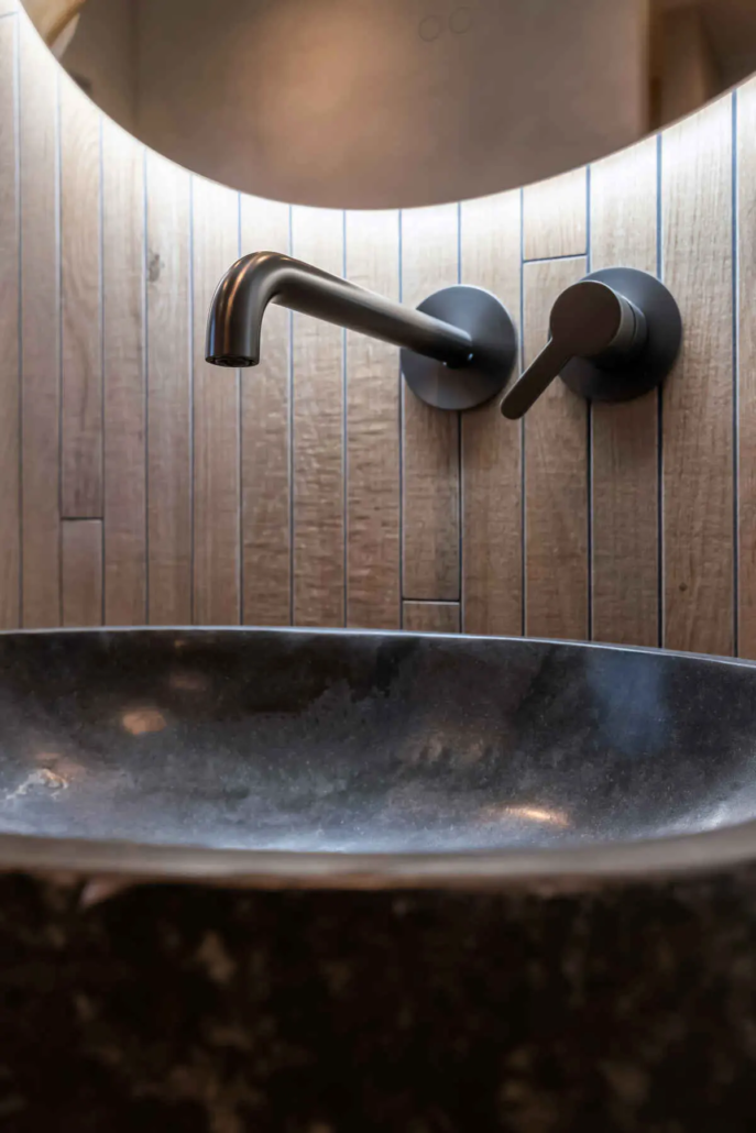 Gunmetal kranen en lameltegels geven karakter aan de badkamer