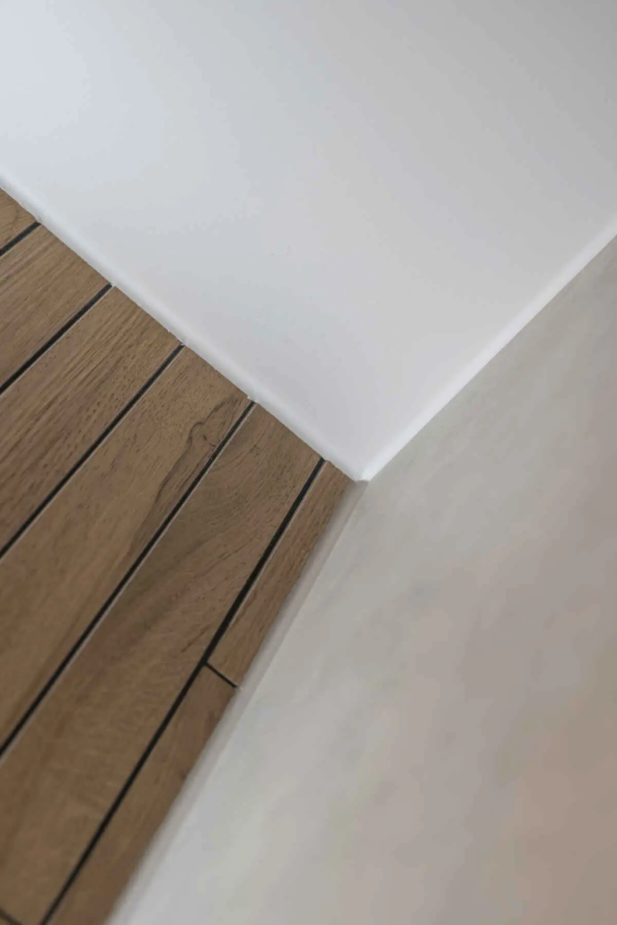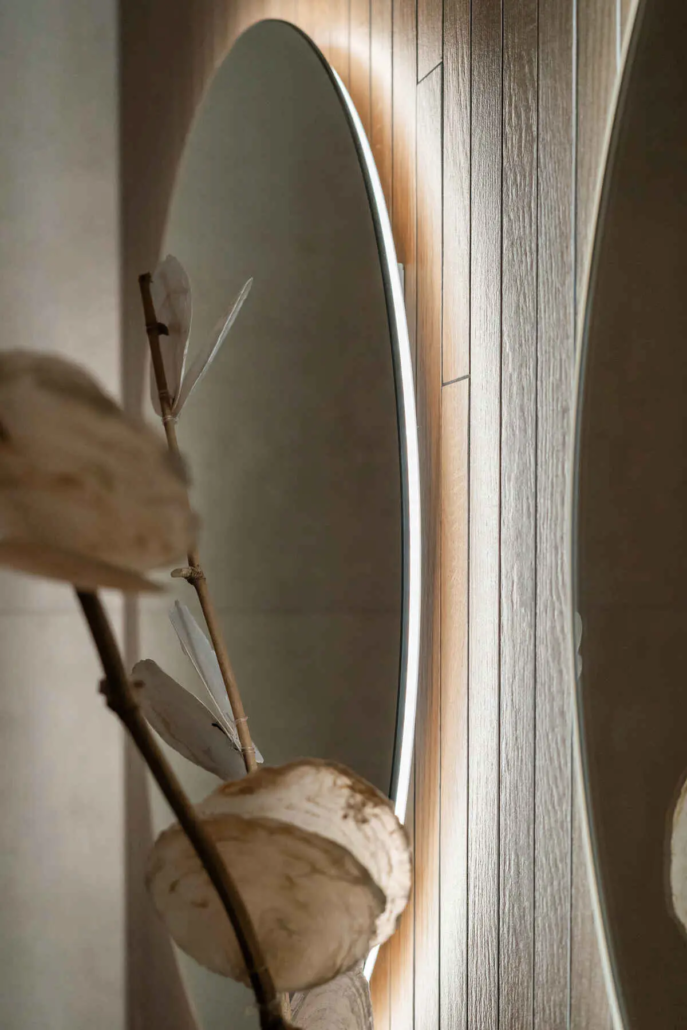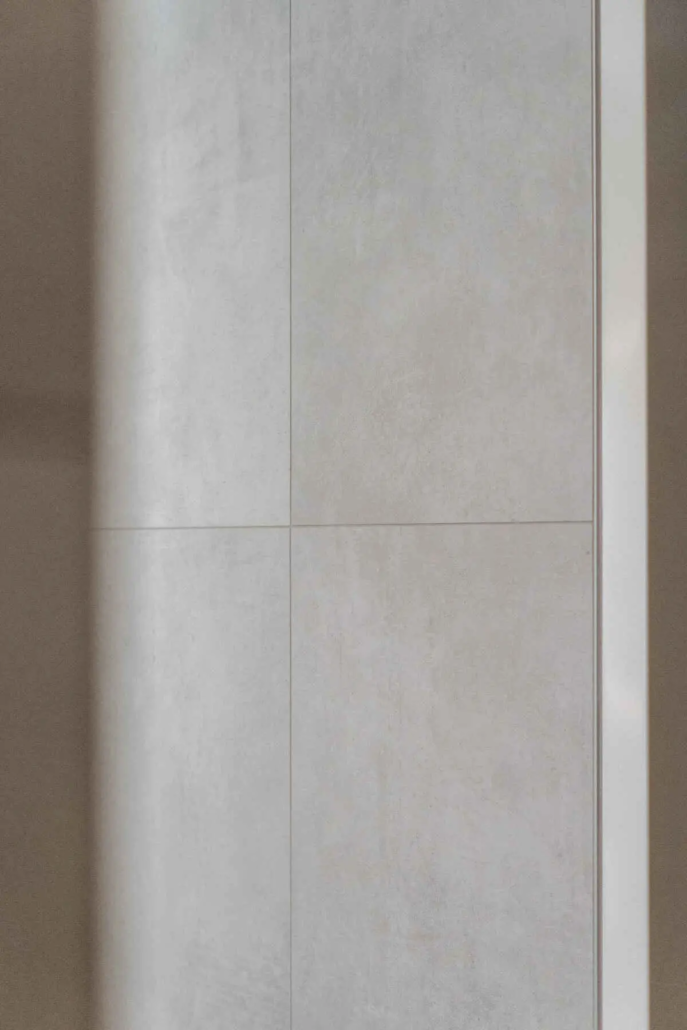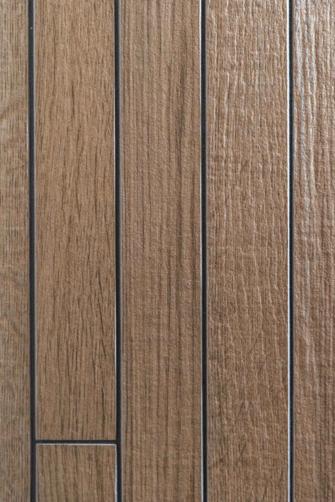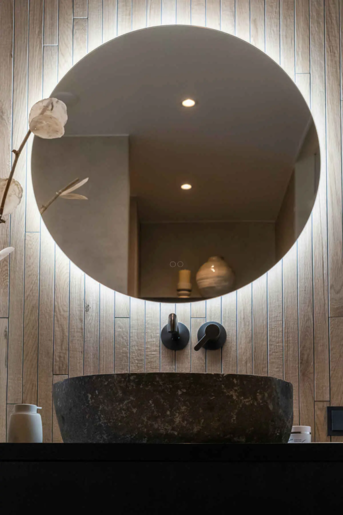 Een echte blikvanger is de wand achter het wastafelmeubel. “Wij wilden zo’n paneel, een hout paneel. Uiteindelijk heeft Marco ons daar ook in geadviseerd door een soort tegel in lamelvorm te nemen.” Het resultaat? “Ze hebben echt een soort houtlaminaat tegel in lange banen gesneden, en zo hebben we dus een houten paneel look aan de achterkant.”